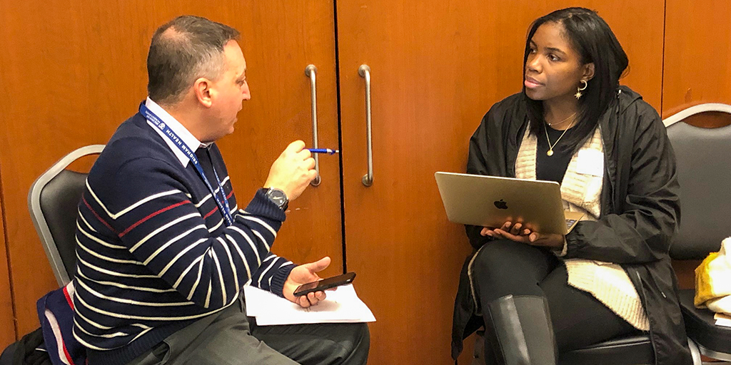 From left: Michael Mirabile meets with Cheyanne Perryman, an SSJP alumna and recent college graduate.